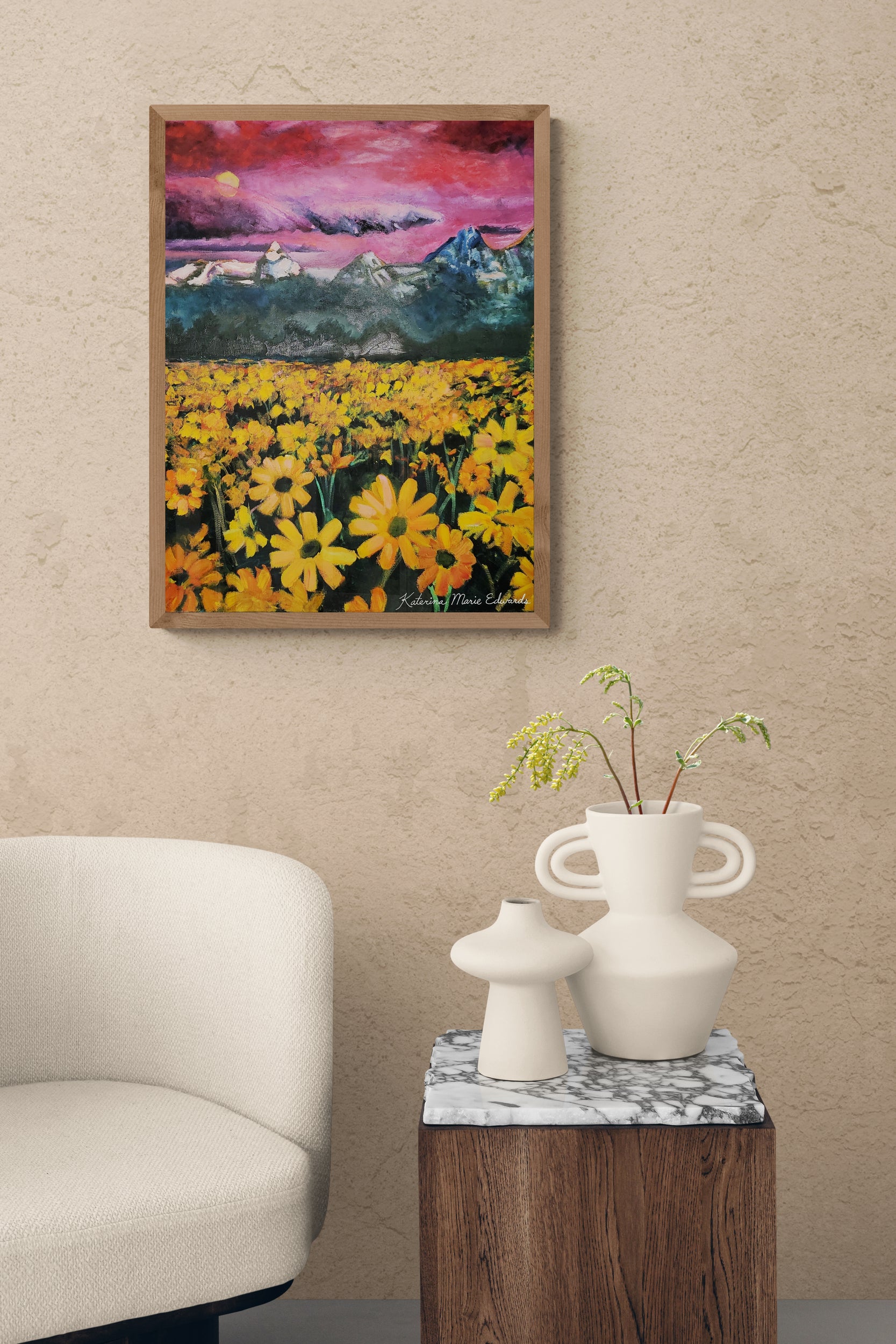 Sunshine Fields radiates with the vitality of nature’s embrace — where wildflowers dance beneath a sky brushed with rose and violet, and mountain peaks stand as quiet guardians. This joyful composition captures the spirit of carefree afternoons and the deep exhale of basking in beauty.