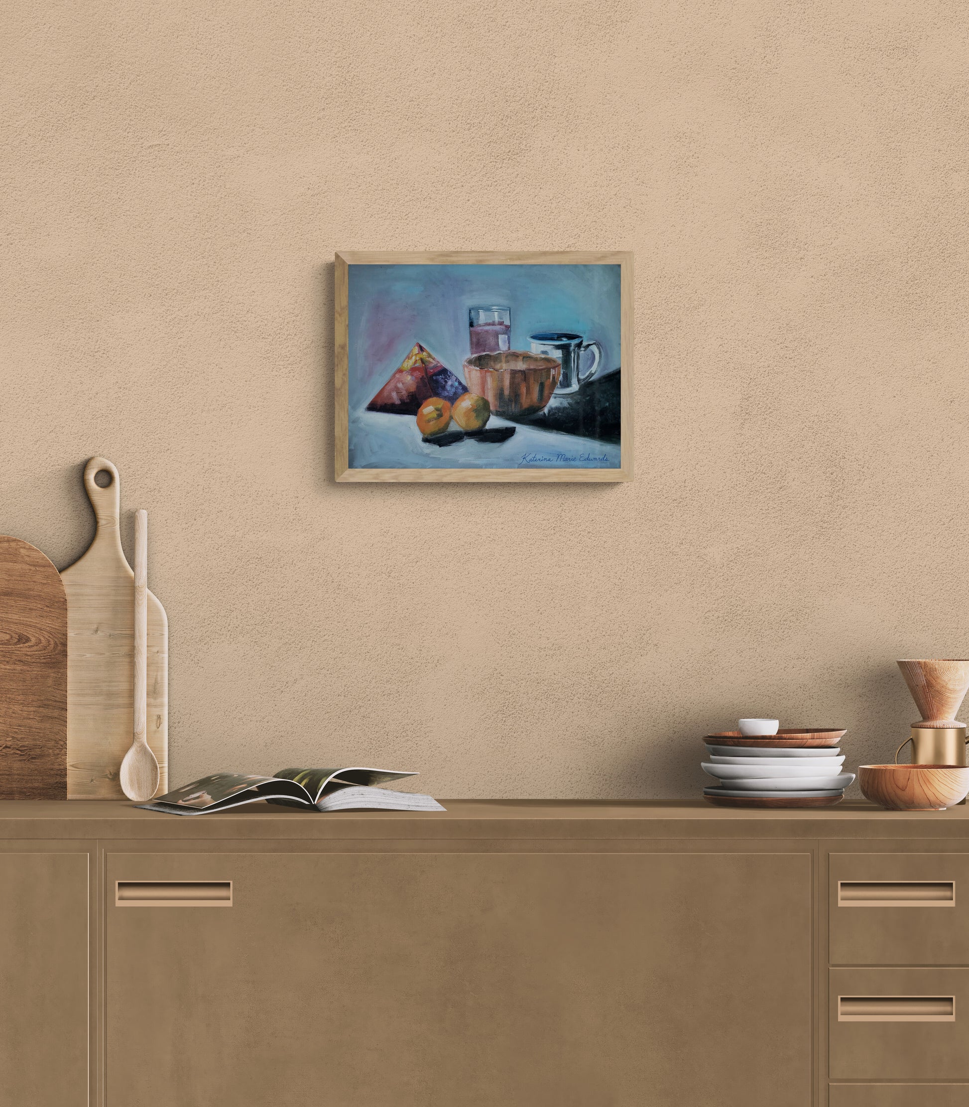 Tea, Treasure, and Tangerines is a whimsical still life that turns a simple morning into a sacred ritual. A shimmering glass of water, a grounding mug, a sunlit tangerine — each element a tiny altar to presence and pleasure.