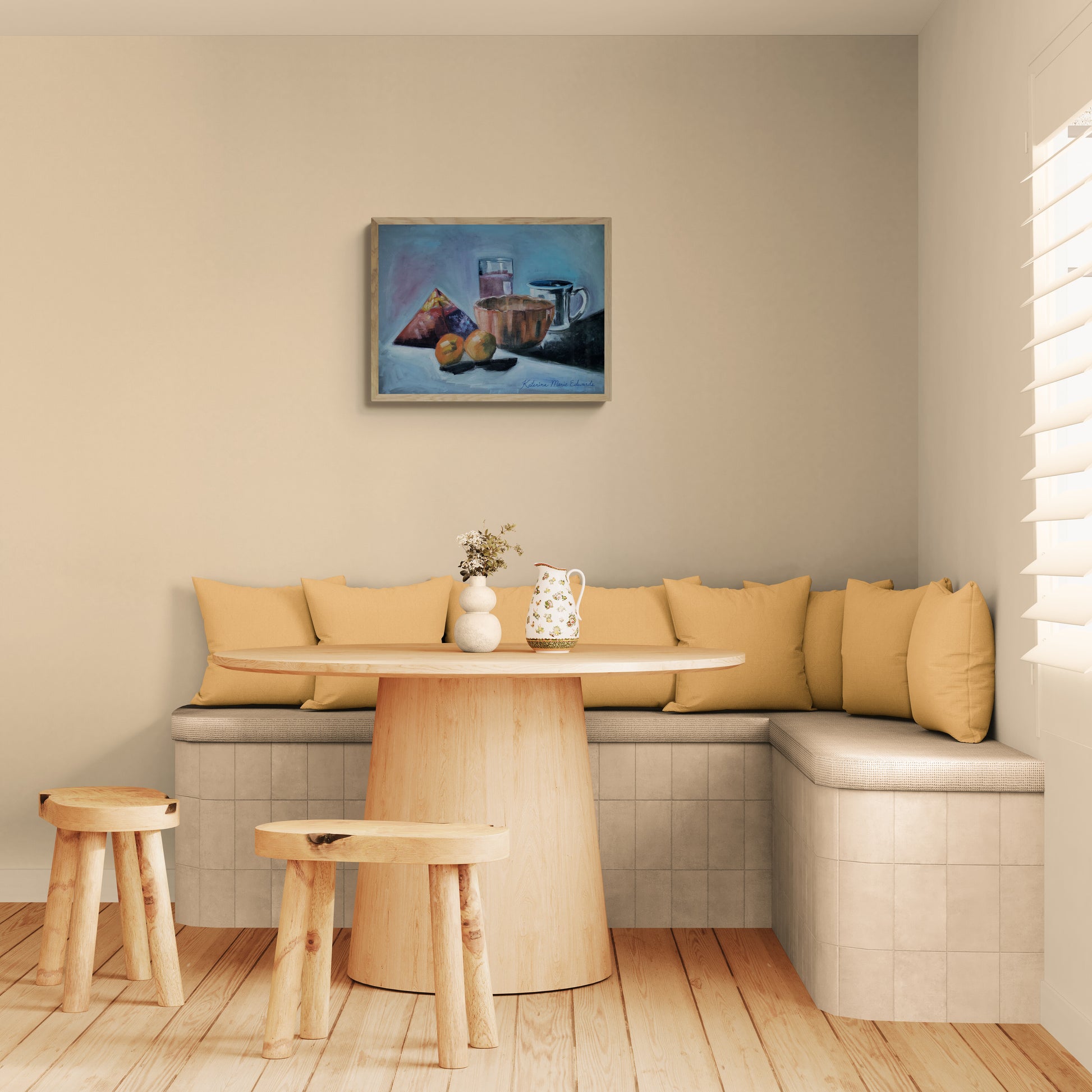The golden pyramid nods to hidden wisdom. The textures and tones invite you to pause and sip the moment.